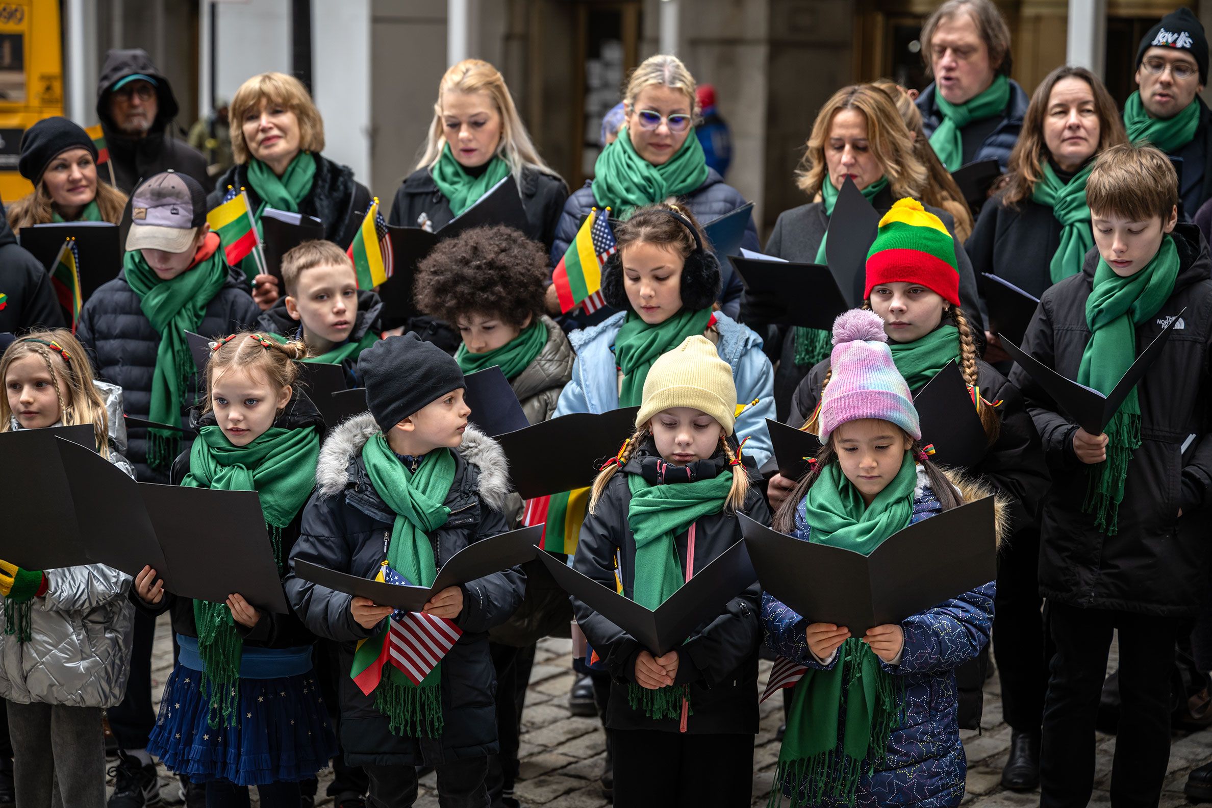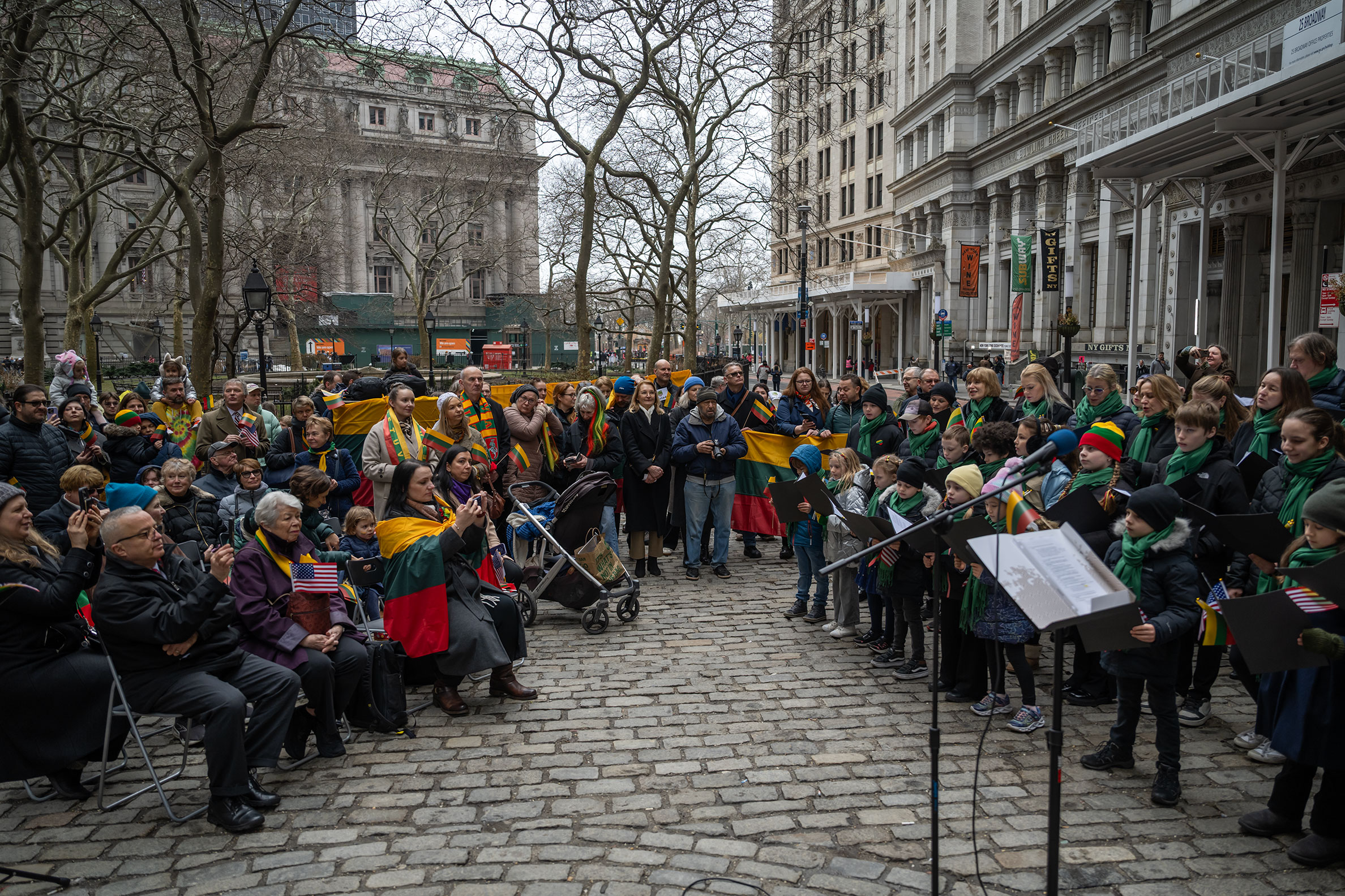 On Saturday, those threads of history converged in a two-hour programme that mixed the formal and the communal. The New York Lithuanian Mixed Choir and the New York Maironis School Youth Choir, conducted by Laura Vidžiūnaitė and Gediminas Keras, performed Lithuanian folk songs — Baltas paukštis (The White Bird), Mano namai (My Home), Mūsų žemė (Our Land) — their melodies rising between the towers of the Financial District.