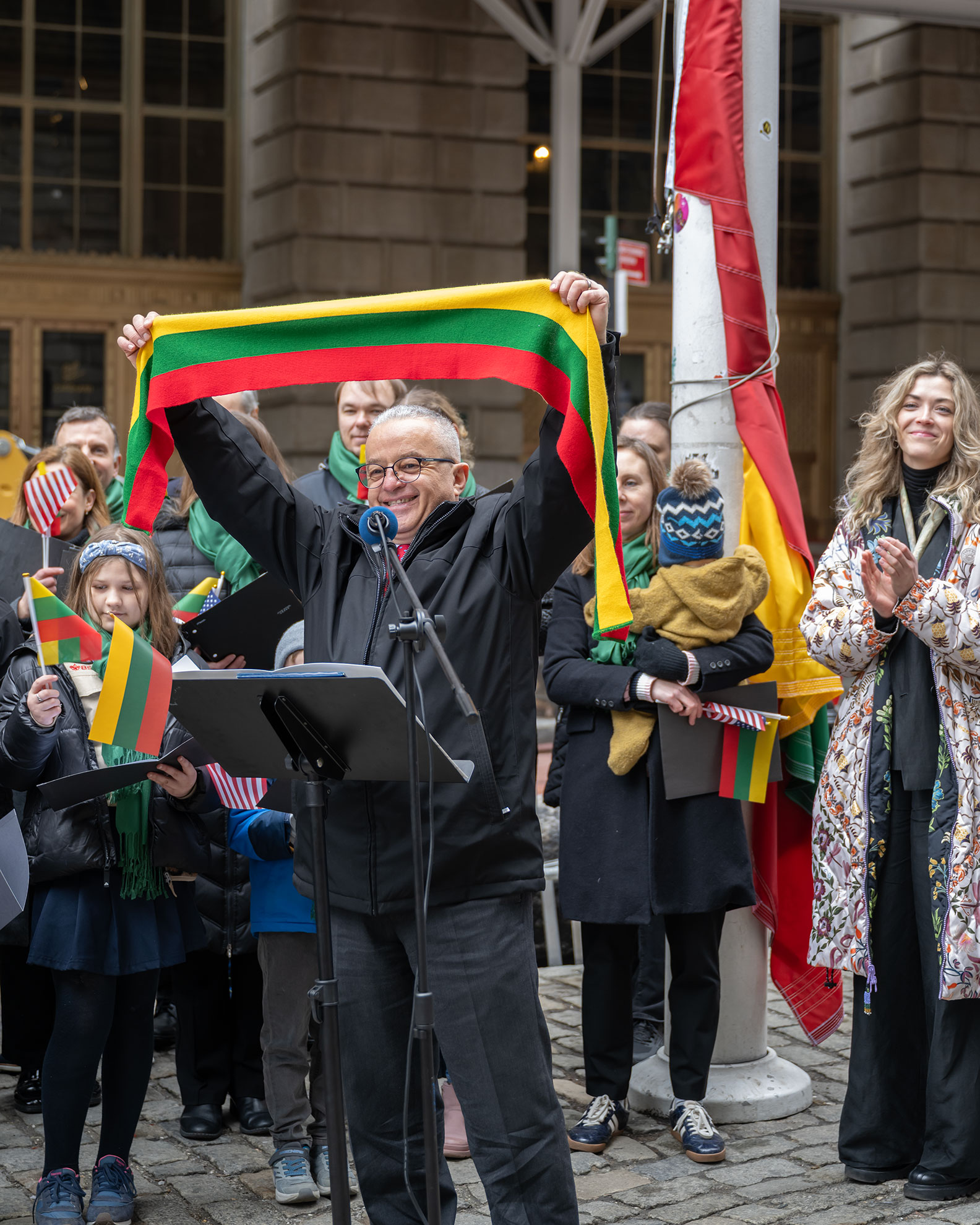 The excavators were still rumbling in Lower Manhattan’s financial district when the crowd gathered at Bowling Green Park last Saturday morning. Draped in Lithuanian tricolours — yellow, green, red — they had come to mark something that, in the grinding rhythm of New York’s weekends, could easily pass unnoticed: a flag-raising ceremony for Lithuania’s Independence Restoration Day, held for the first time in this precise location.